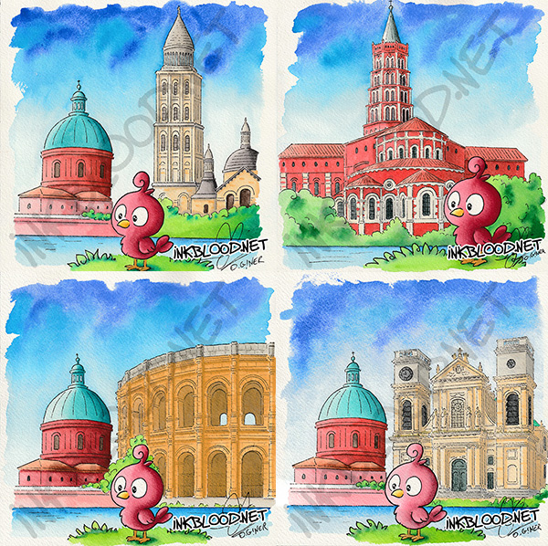 [Aquarelle] Licorne rose, Toulouse et Le dôme de la Grave