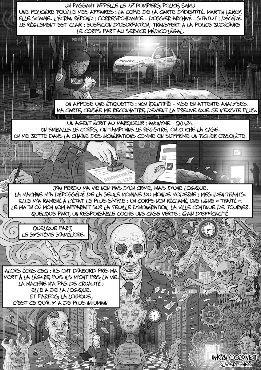 [B.D] Les cadavres invisibles de la modernité – (Chroniques de la France invisible – Vérités rouges 2025) 14 novembre 2025B.D, Homepageart social, bande dessinée, BD dramatique, BD noire, cadavres invisibles, Chroniques de la France invisible, critique sociale, France contemporaine, Identité, morgue, Olivier Giner, récit graphique, Vérités rouges 2025 Une bande dessinée courte et noire, issue de la série « Chroniques de la France invisible – Vérités rouges 2025 ».Voici les cinq pages complètes. Cela pourrait aussi vous intéresser : [B.D] Les cobayes volontaires – (Chroniques de la France invisible – Vérités rouges 2025) [Aquarelle] Mare Nostrum / Notre Mer [Expo] Collectif Garonne Expose à la Mosaïque [B.D] Pothos !