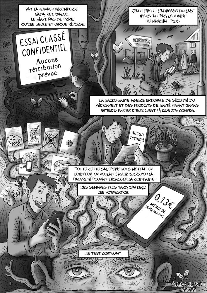 BD Les cobayes volontaires : Chroniques de la France invisible 14 novembre 2025B.D, Homepagebande dessinée, bd, BD noir et blanc, Chroniques de la France invisible, Expériences cliniques, Fiction sociale, histoire courte, illustration, inkblood, Olivier Giner, satire sociale, Vérités rouges 2025 Les cobayes volontaires est une bande dessinée courte tirée des Chroniques de la France invisible – Vérités rouges 2025.Voici les trois pages complètes. Cela pourrait aussi vous intéresser : [B.D] Tripartition Française [Grande Aquarelle] Destruction de la basilique St-Sernin à Toulouse par le grand dragon rouge [B.D] Politique démocratique [B.D] Réseaux